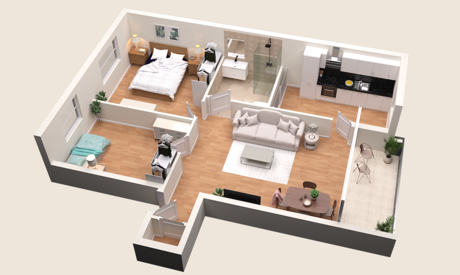 Großes Wohnzimmer mit angeschlossenem Balkon, zwei Schlafzimmer, schwellenloses Duschbad, separate Küche.